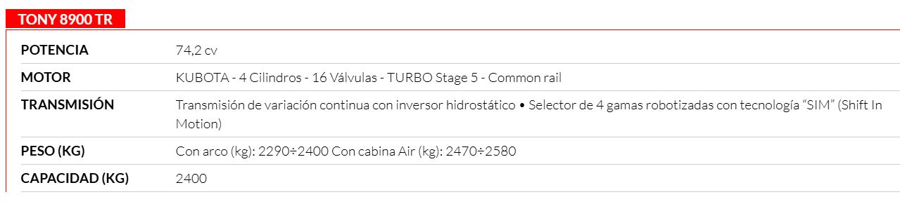 El Tony 8900 TR combina innovación y eficiencia, posicionándose como un tractor compacto y reversible con transmisión de variación continua diseñado para los desafíos más exigentes en la mecanización agrícola. Equipado con un motor Kubota de 4 cilindros turbo y 74.2 CV, ofrece versatilidad y rendimiento en terrenos difíciles y espacios estrechos.